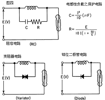當(dāng)將干簧管用于感性負(fù)載,例如電動機÷繼電器線圈、螺線管等,其觸點在(負(fù)載電路)觸點開路時將加有高感生電壓。這種(瞬態(tài))高感生電壓可能會損害干簧管或者明顯地降低干簧管地壽命。因此建議采用保護電路,例如阻容(吸收)電路、變阻器或鉗位二極管電路(見圖四)。