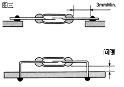 • 當(dāng)在PCB板上安裝干簧管時,建議形成引線角并在PCB板與干簧管之間留下適當(dāng)空間,或者將干簧管插入PCB板種的開口(切口)種(見圖三)
