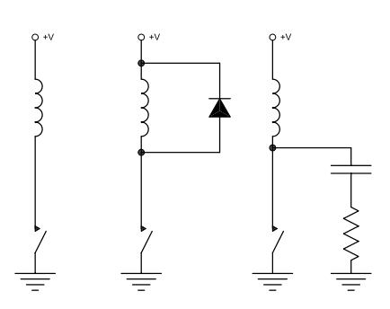 切換電感負載如繼電器,螺線管,線圈計算器,小型馬達或電感電路等都需要防護電路去延長干簧開關的壽命(見下圖)。公式#1 描述感應性的關系。一旦電流流過電感器,它會傾向維持這個電流,如果這電流突然間終結,公式#1內的di/dt可以變得很大,這凈效應可以由大的電流流經過開關造成。在開關打時,電弧放電會隨之而起,如果這電弧放電持續產生則會造成開關破裂。很多時候可通過加設RC 網絡和二極管遏抑器令雙方互相抑制(見下圖)。