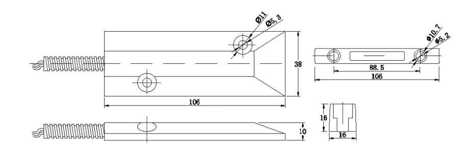 4)、在安裝過程中,表面貼裝時干簧管的觸點位置與磁鐵的磁力線最高點一定要平行安裝;但在嵌入式暗裝時,磁鐵和干簧管兩部份要相向平行在一條線上,這樣才可以取得最佳的感應距離。且兩部份最好無間隙安裝,間距越小越好,最大間隙不應超過5mm(卷簾門除外)。如果錯位安裝將導致啟動感應距離的縮短,甚至感應不到任何信號的時候,就會導至開關失靈。