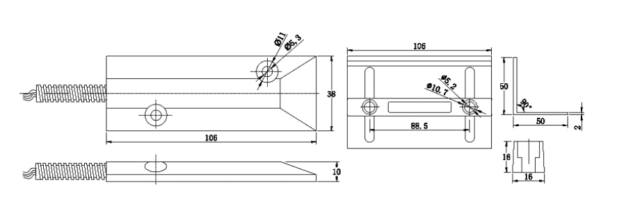 4)、在安裝過程中,表面貼裝時干簧管的觸點位置與磁鐵的磁力線最高點一定要平行安裝;但在嵌入式暗裝時,磁鐵和干簧管兩部份要相向平行在一條線上,這樣才可以取得最佳的感應距離。且兩部份最好無間隙安裝,間距越小越好,最大間隙不應超過5mm(卷簾門除外)。如果錯位安裝將導致啟動感應距離的縮短,甚至感應不到任何信號的時候,就會導至開關失靈。